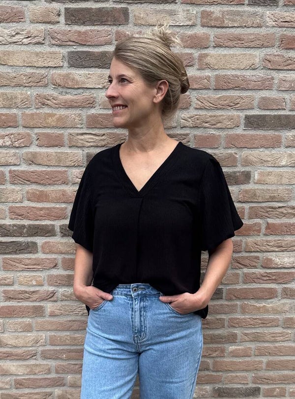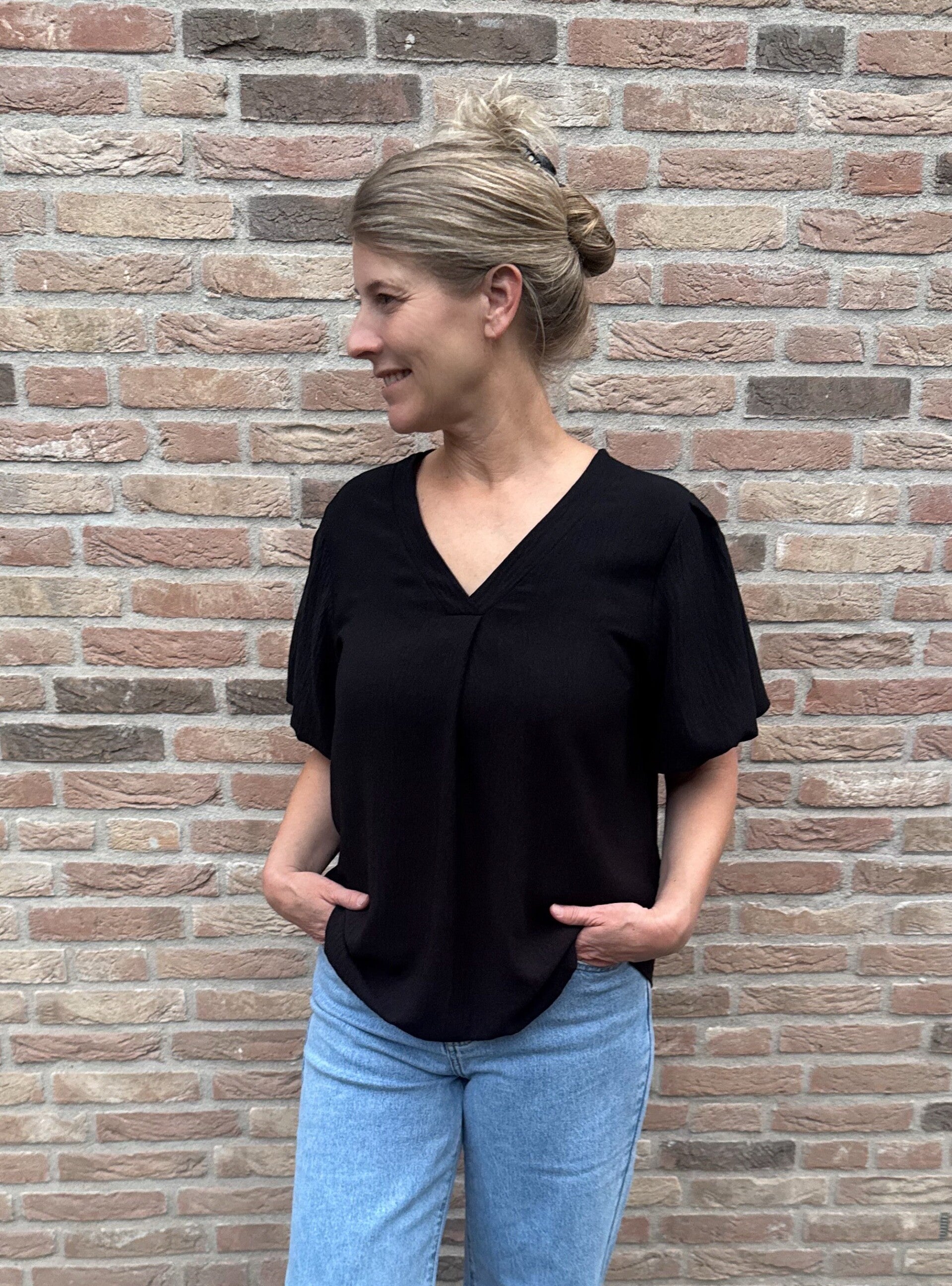 Het model is 167 cm lang en draagt een maat one size. De top is te dragen tot en met maat 42.