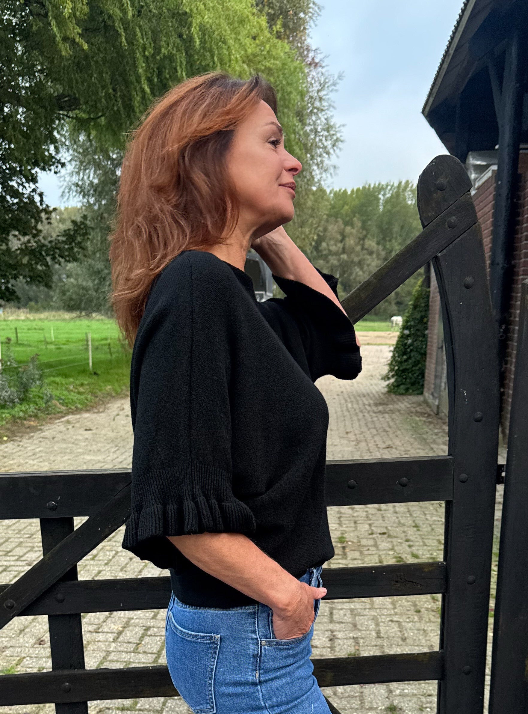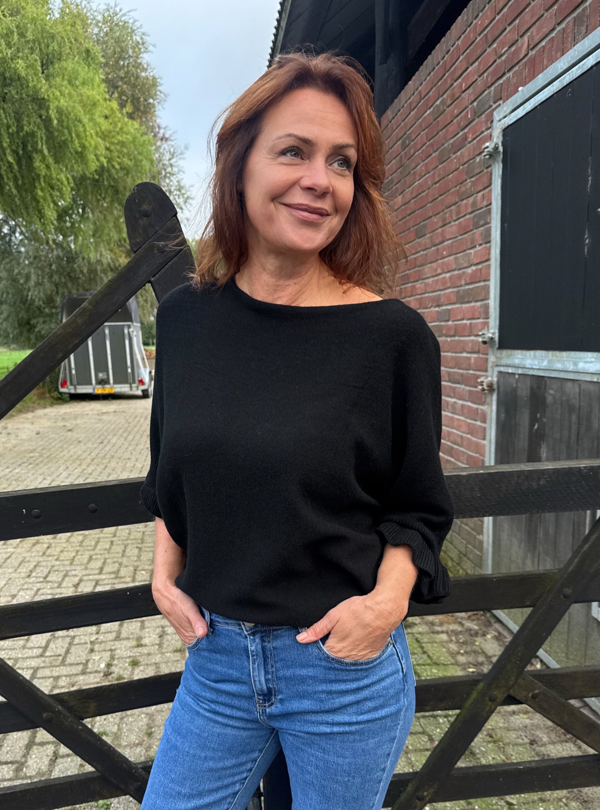 Het model is 167 cm lang en draagt de maat one size. De trui is te dragen tot en met maat 44 en is in meerdere kleuren verkrijgbaar.
