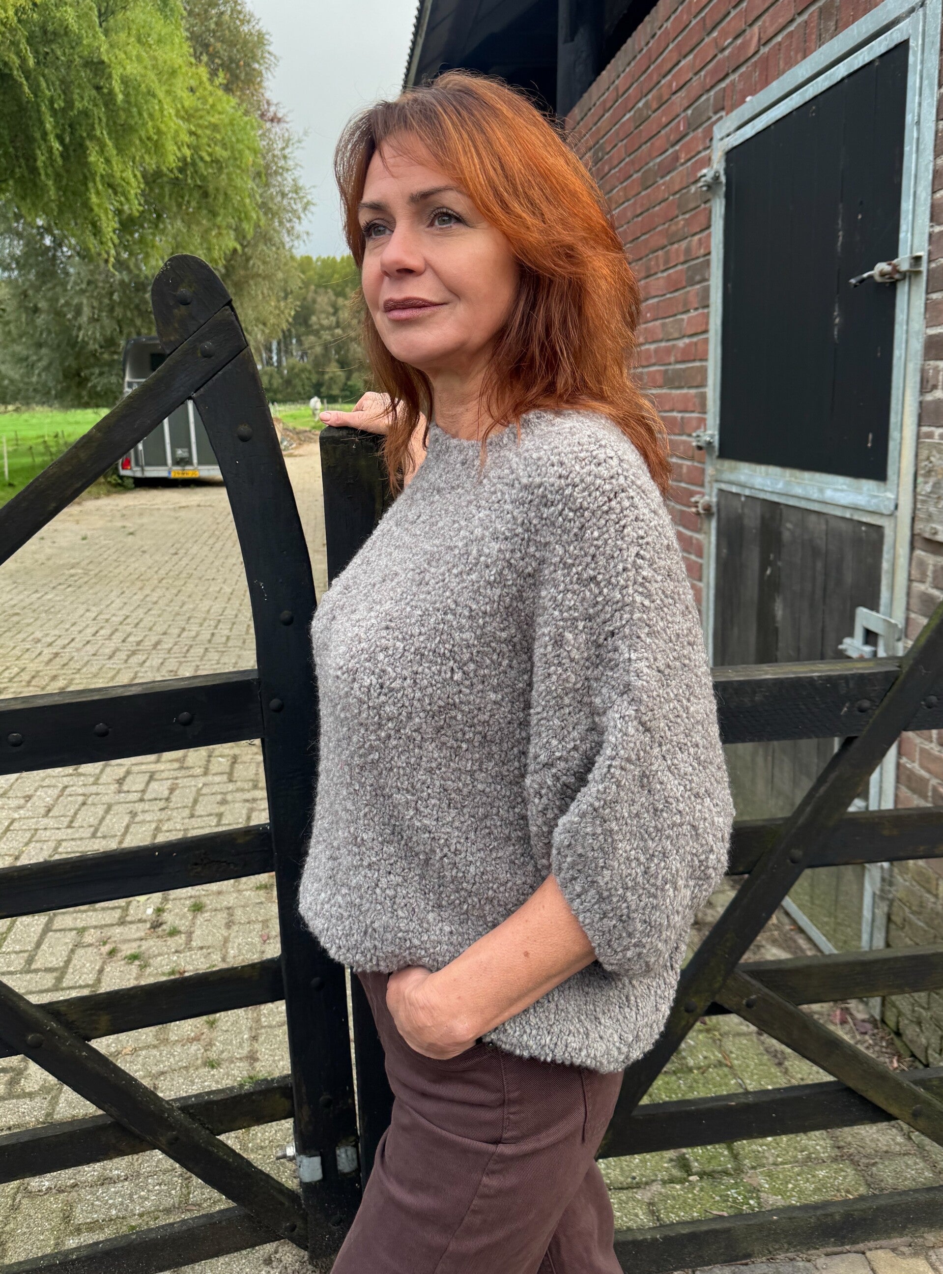 Het model is 167 cm lang en draagt de maat one size. De trui is te dragen tot en met maat 46 en is in meerdere kleuren verkrijgbaar.