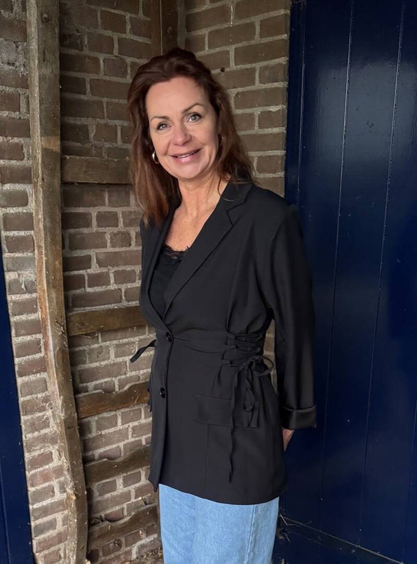 Het model is 167 cm lang en draagt de maat one size. De blazer is te dragen tot en met maat 42 en is in meerdere kleuren verkrijgbaar. De blazer is qua grootte verstelbaar via de strikdetails.