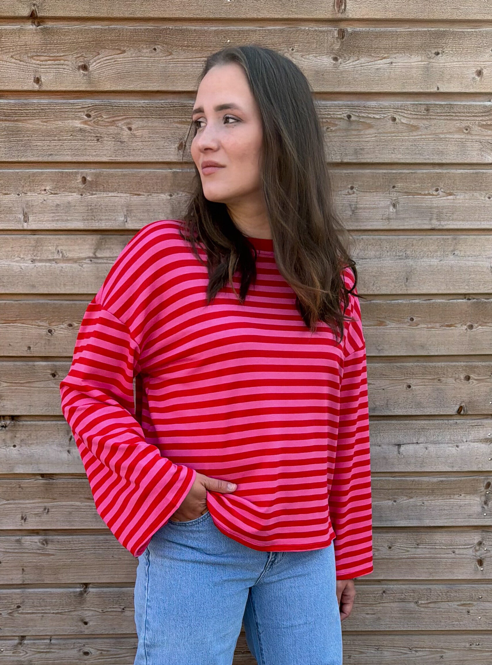 Gestreept shirt met lange pofmouw - rood/roze