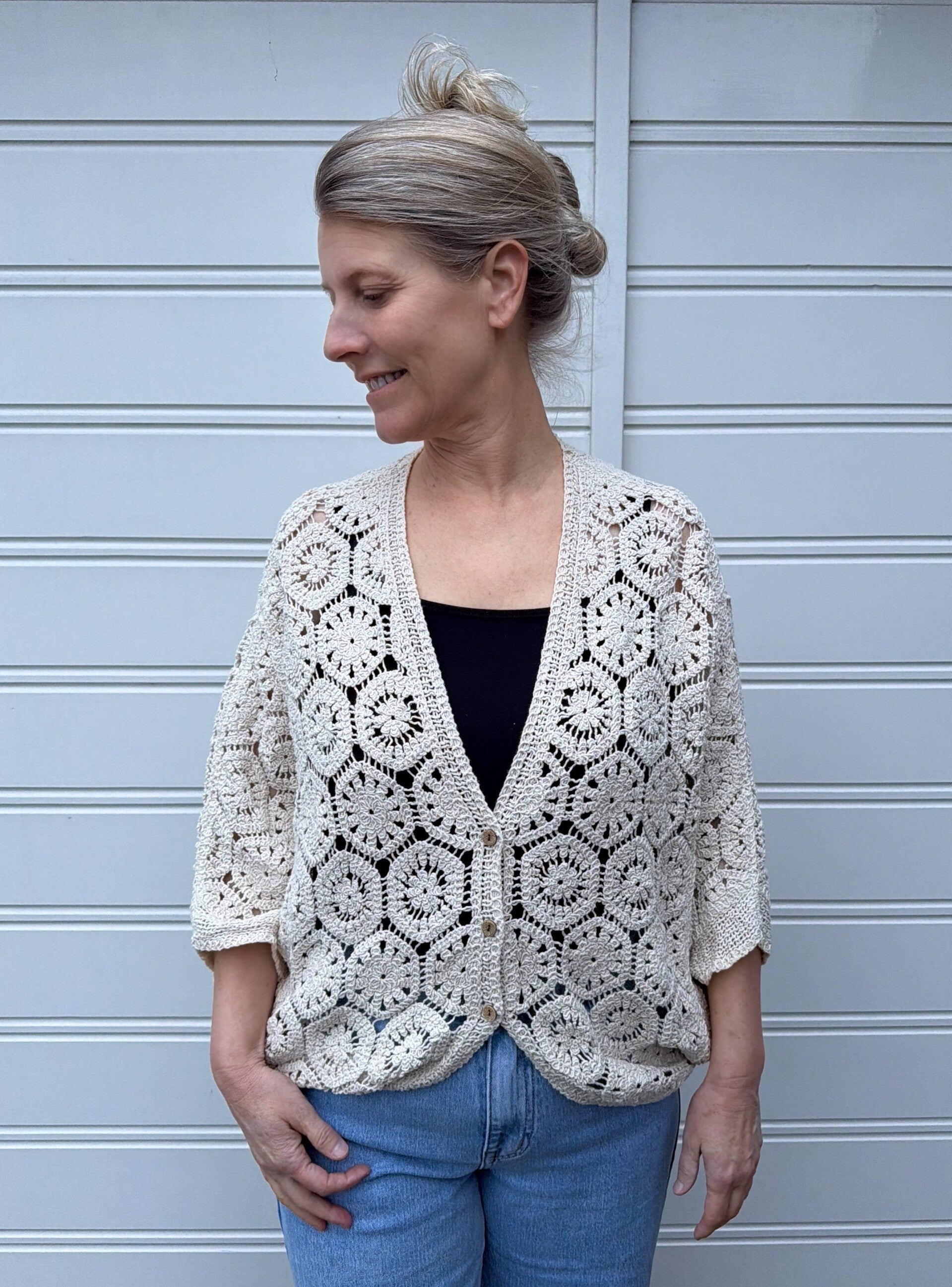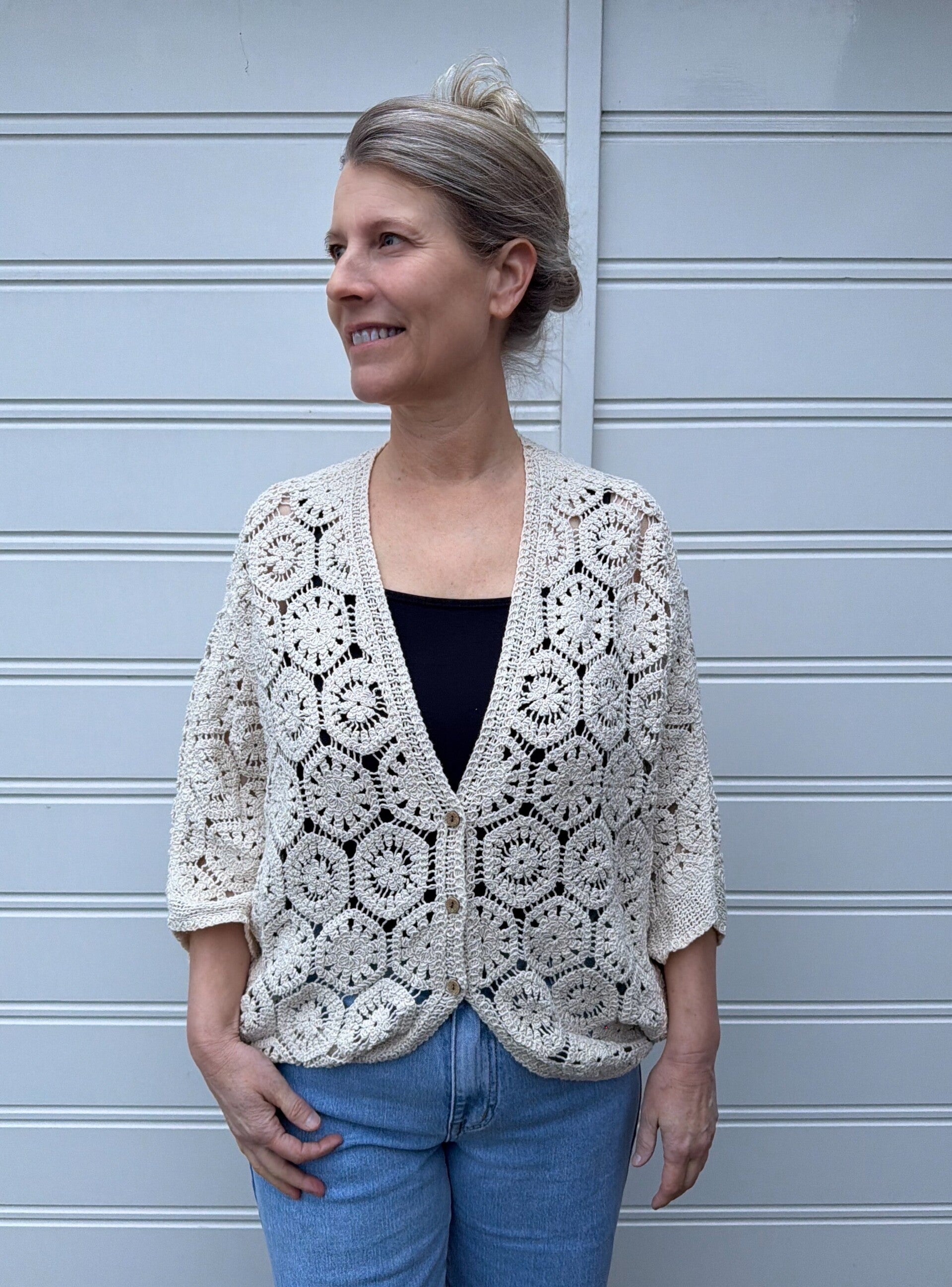 Het model is 167 cm lang en draagt een maat One Size. Het vestje is te dragen tot en met maat 44.