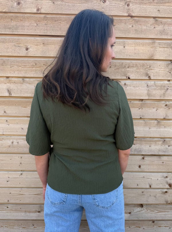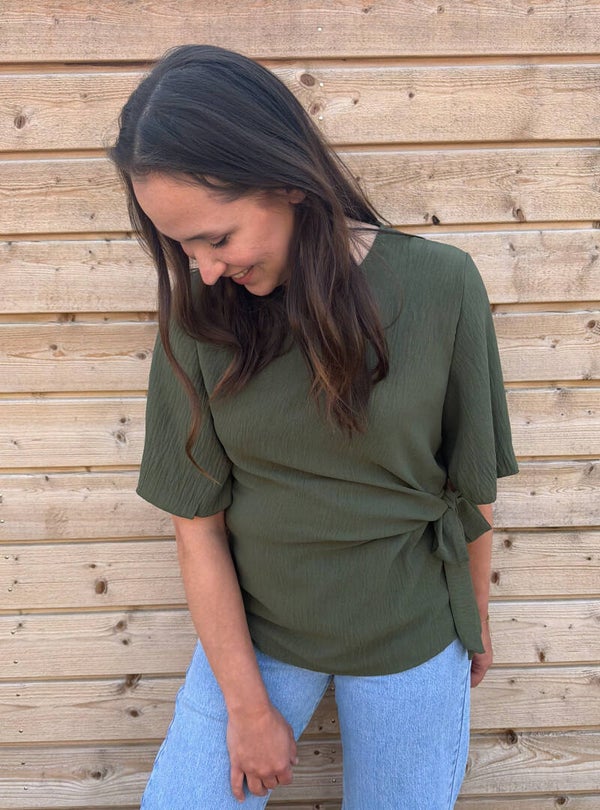 Het model is 172 cm lang en draagt een maat one size. Het shirt is te dragen tot en met maat 42.